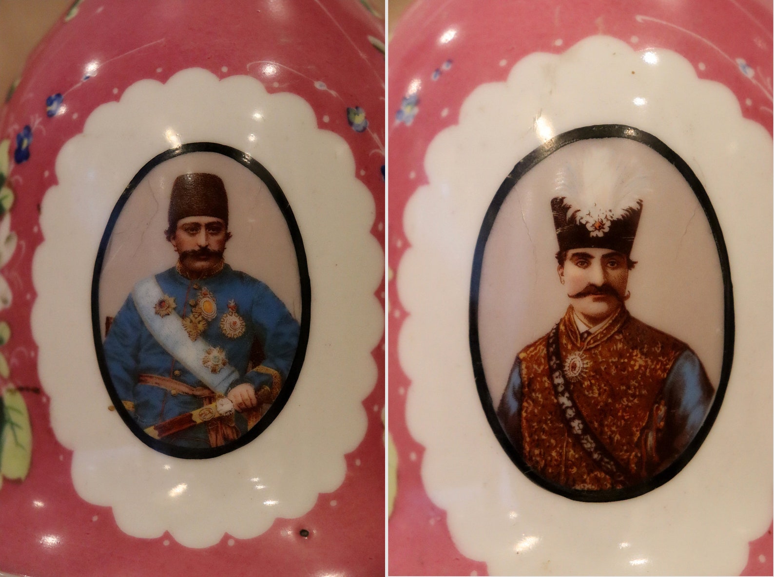 The huqqa is crafted from hard-paste porcelain which is a bold pink colour with white bands. Its base is finely painted with white oval medallions, containing detailed half-length portraits of the Qajar kings of Persia, Naser al-Din Shah (ruled 1848-1896) and Mozaffar al-Din Shah (ruled 1896-1907). These medallions are framed by green, yellow, pink and orange flower garlands, within blue pointed arches. Intricate painted depictions of orange fruits decorate the huqqa’s stem and top. Like the base, the top also features half-length portraits of the Persian kings, Naser al-Din Shah and Mozaffar al-Din Shah.